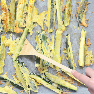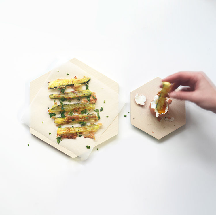 Zajtrki so pri nas kar priljubljeni, kot ste verjetno že sami ugotovili. Danes z vami delimo bolj zdravo alternativo za pomakanje v mehko kuhan jajček. Recept zanjo smo našli tukaj. Bučkice smo narezali na pomfrit velikosti, jih povaljali v enem prežvrkljanem jajčku in ločeno v naribanam parmezanu, potem smo jih postavili na s peki papirjem obložen pekač, posolili in popoprali. Po 15 minutah peke na 200 stopinjah Celzija, jih obrnite (z našo spatulo ;) ) in nato jih pecite še 12 min na 170 stopinjah. Postrezite jih na deščici posute z nasekljanim peteršiljem.